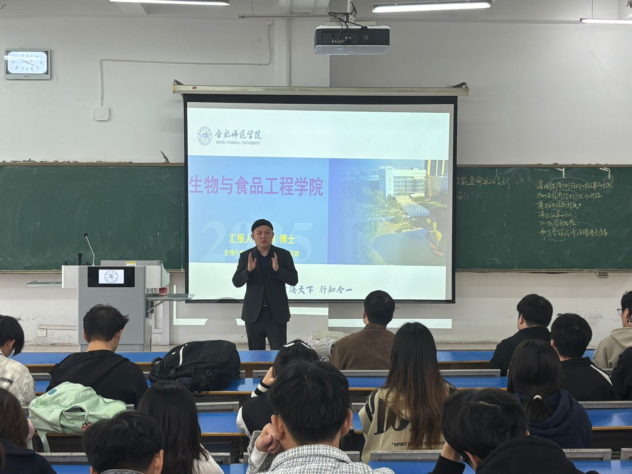 为吸引更多优秀生源报考我校生物与食品工程学院硕士研究生,10月14日至15日,学院党委副书记李万成、生物制药系主任张雁、研究生教学部周鹏老师组成研究生招生宣讲团赴亳州学院、淮南师范学院等校开展招生宣讲会。亳州学院生物与食品工程系、淮南师范学院生物工程学院近100名有考研意向的学子参加了宣讲会。