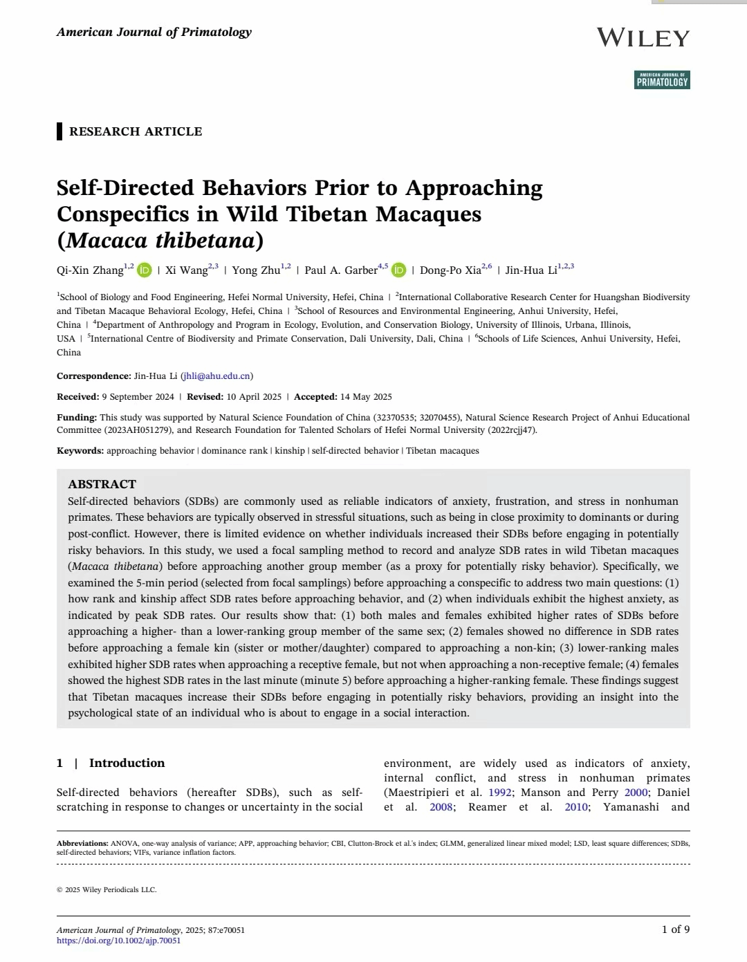 近日,生物与食品工程学院李进华教授团队在《American Journal of Primatology》(中国科学院二区)在线发表了题为“Self-Directed Behaviors Prior to Approaching Conspecifics in Wild Tibetan Macaques (Macaca thibetana)”的科研论文,该研究为理解群居非人灵长类动物对社会关系认知提供新的参考。
