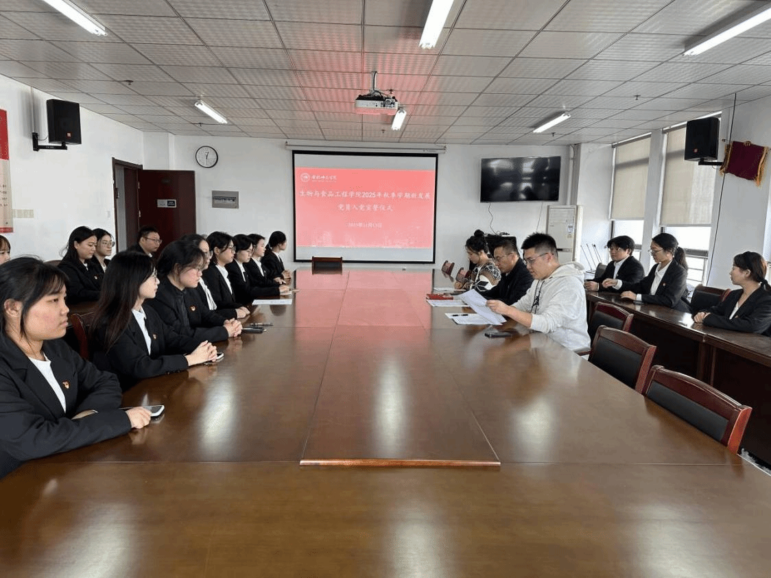 为激励新发展党员坚定理想信念、牢记初心使命,11月13日,生物与食品工程学院在行知楼1502室举行2025年秋季学期新党员入党宣誓仪式。学院党委副书记李万成、学生党支部书记徐浩然、李林溶及全体新发展党员参加仪式。