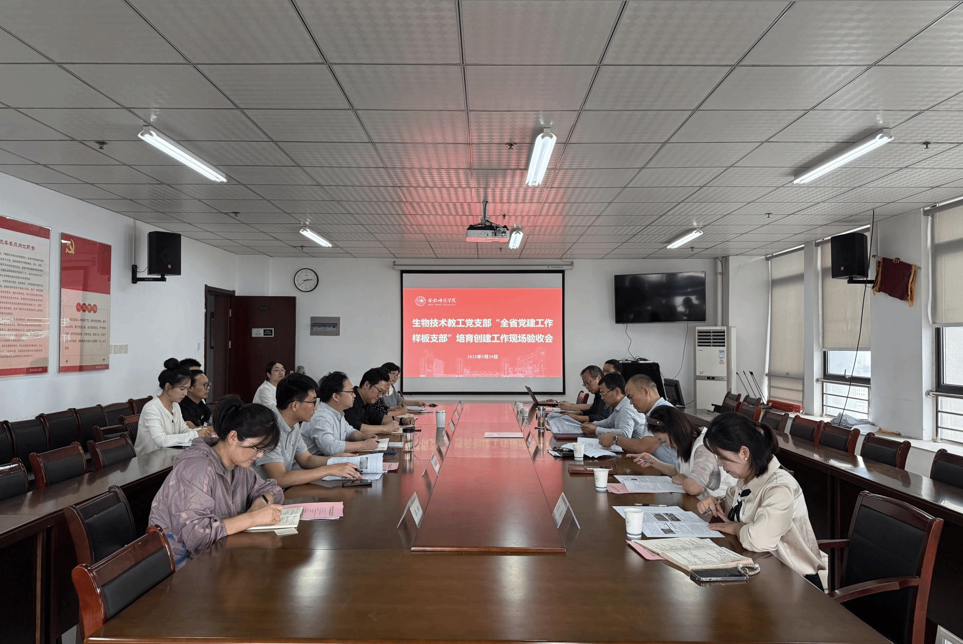 2025年9月29日下午,生物与食品工程学院生物技术教工党支部“全省党建工作样板支部”培育创建工作现场验收会在锦绣校区行知楼1502会议室顺利召开。校党委委员、副校长、组织部部长赵帮恚莅临指导。巡察办、人事处、组织部、纪委办等相关职能部门负责人参加会议。会议由生物与食品工程学院党委书记马喆主持,学院领导班子成员、各师生党支部书记、生物技术教工党支部委员及党员代表参加会议。