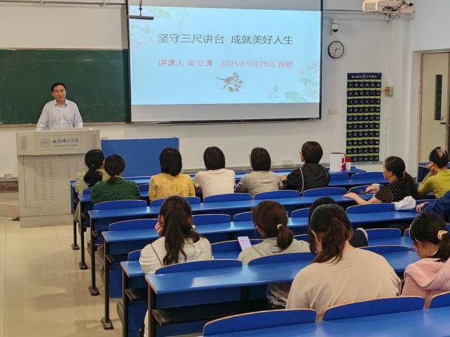 为庆祝建校70周年,2025年9月29日下午,合肥师范学院生物与食品工程学院在锦绣校区逸夫楼109教室举办了一场题为“坚守三尺讲台 成就美好人生”的专题讲座。本次讲座特邀宿州市第二中学生物特级教师、正高级教师、安徽省“江淮学科名师”、享受省政府特殊津贴专家、我院1997届优秀校友吴立清担任主讲。讲座由科研处与生物与食品工程学院联合主办,吸引了众多师生到场聆听。
